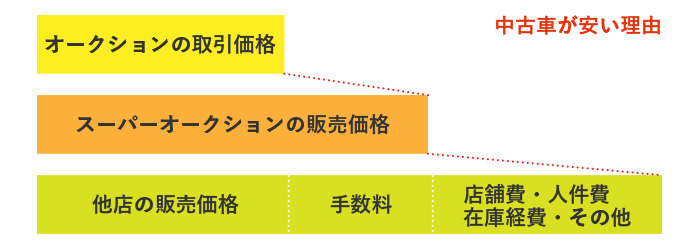 いただくのはオークション手数料のみ。店舗費や在庫経費等の費用がかからない分、お客様により安く中古車をご提供するこが出来るのです。
